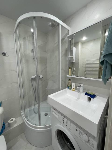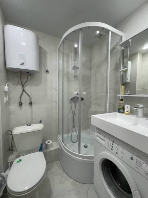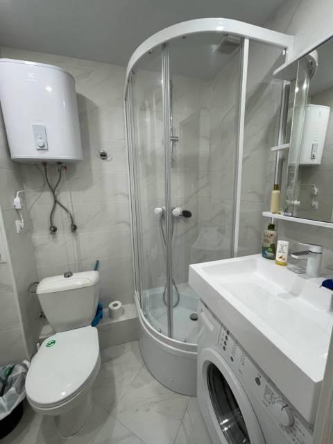 Мебель: Раскладной двухспальный новый диван, Новый кухонный гарнитур, Обеденный стол, Шкаф-купе, Душевая кабина , Угловой шкаф-пенал в душевой. Вся мебель, техника -новые .