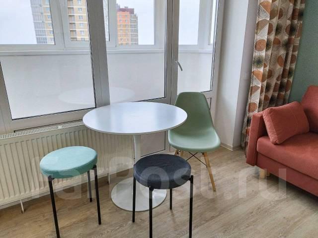 Мебель: Квартира представляет собой пространство с двумя зонами - кухня-гостиная и спальня. В спальне стоят шкаф и комод для вещей, а также удобная широкая двуспальная кровать. Два прохода в спальню можно закрыть плотными шторами и таким образом отделить пространство. В гостиной-кухне находится диван-кровать и круглый стол 80 см. Квартира отличается просторным коридором и ванной комнатой. Между помещением и балконом, практически во всю ширину - витражные окна.