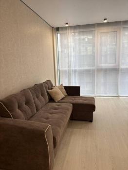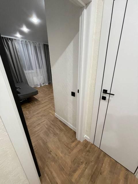 - В квартире установлен влагостойкий ламинат (+ графитовая подложка под него), флизелиновые светлые обои, натяжной потолок (именно белый, без желтизны). Он стоил дороже обычного + теневая окантовка по всему контуру квартиры и + черные розетки и софиты (под единый стиль). Так-же, установлены скрытые гардины, где дверь на балкон и у второго окна в комнате.