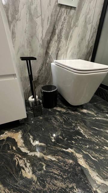 - Т.к делал для себя, то установлен керамогранит (под дерево и бетон), выглядит очень красиво. Где углы - сделан "запил под 45 градусов" и установлен скрытый лючок.