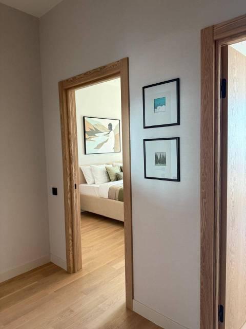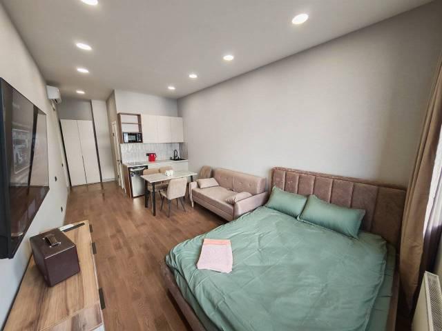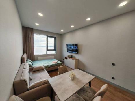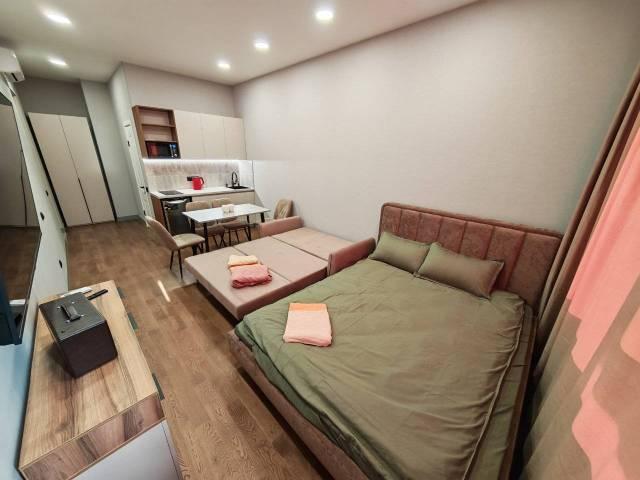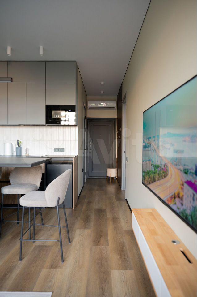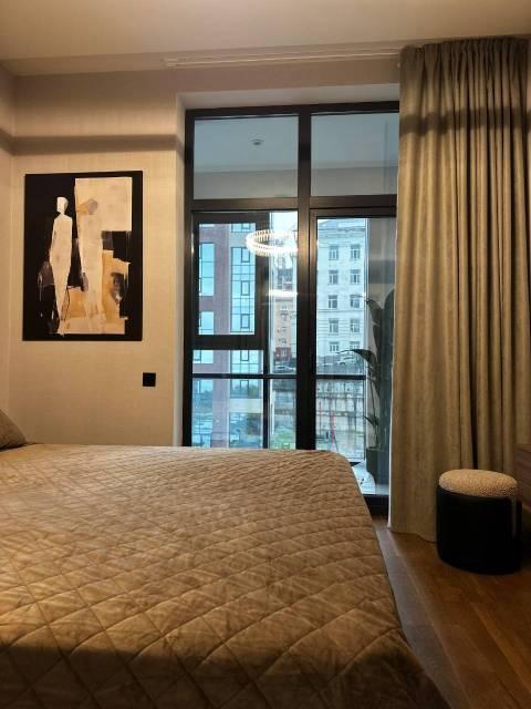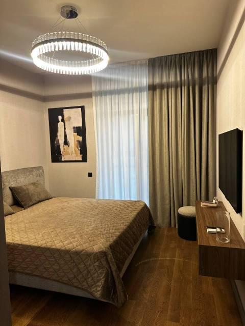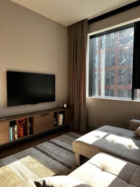 Отдельная комната - гардеробная, большая лоджия с остеклением в пол, спальня, кухня гостиная. Телевизор в каждой комнате, кондиционер в каждой комнате, инженерная доска на полу, алюминиевые окна, потолки 3м.