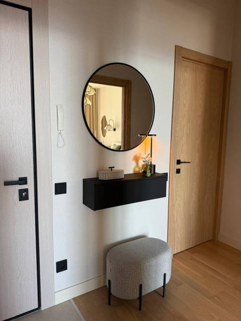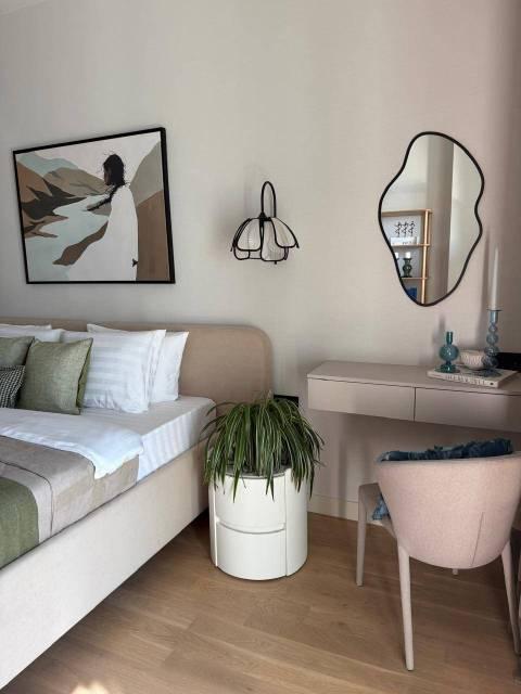 Спальня: 2-я кровать "Аскона", ортопедический матрас 160*200, , зеркало в полный рост, корпусная мебель изготовленная на заказ по дизайн проекту : прикроватные тумбочки туалетный столик , большая оборудованная гардеробная. Кухня-гостиная: диван раскладной спальное место 160*200, обеденный стол со столешницей из керамогранита, 4 стула, корпусная мебель изготовленная на заказ по дизайн проекту : тв-зона, консоль, кухонный гарнитур со встроенной мебелью. Прихожая: консоль, зеркало в полый рост, оборудованная гардеробная. Квартира укомплектована постельными принадлежностями, акссесуарами и текстилем по дизайн проекту.