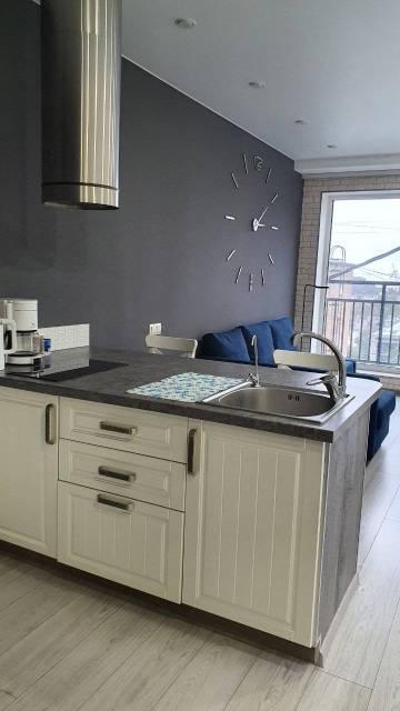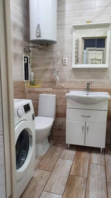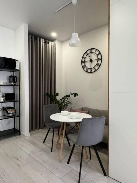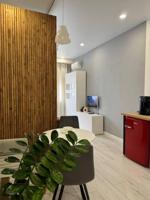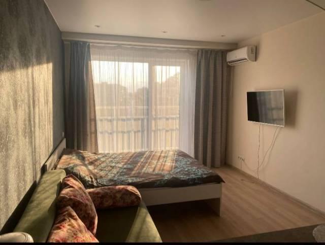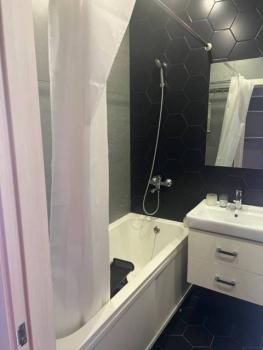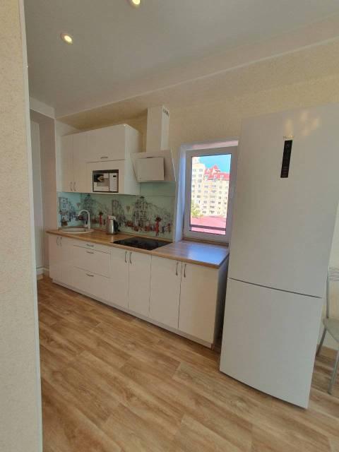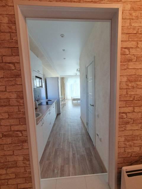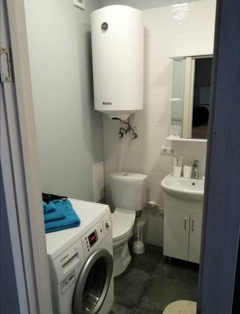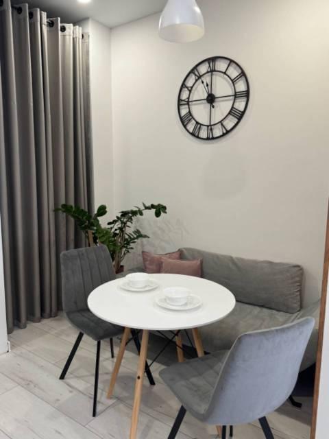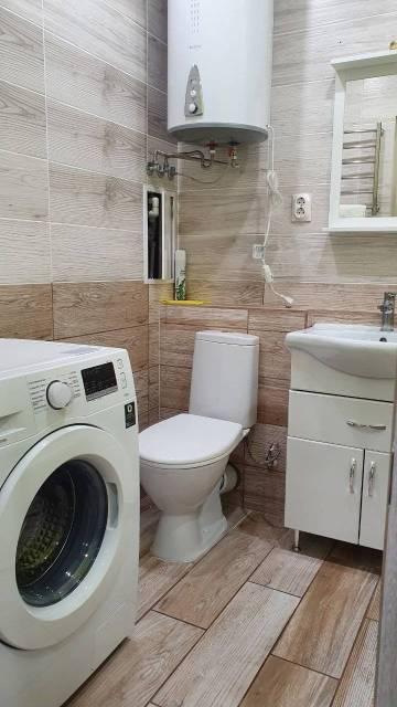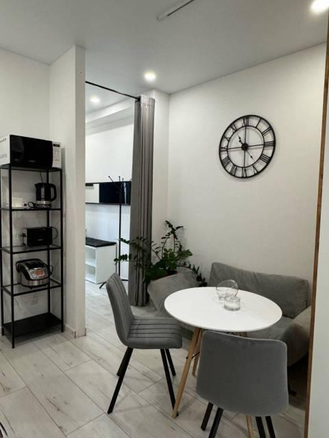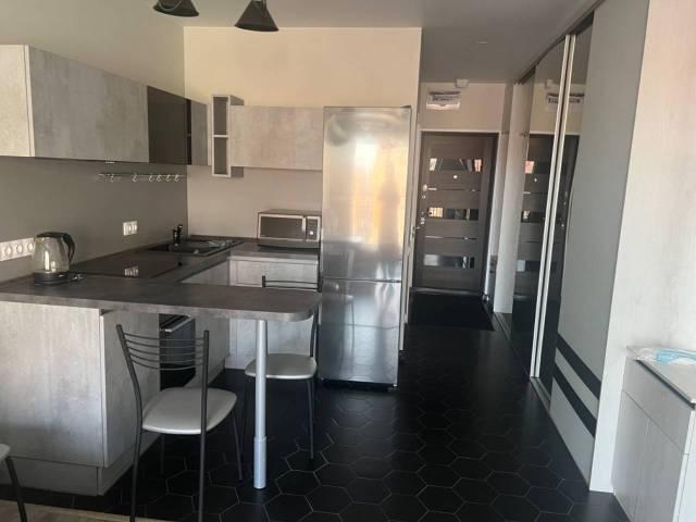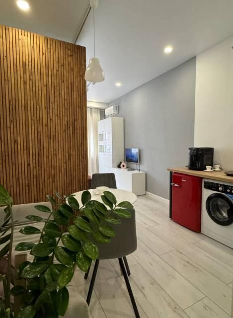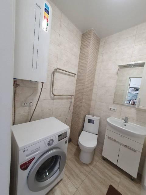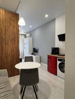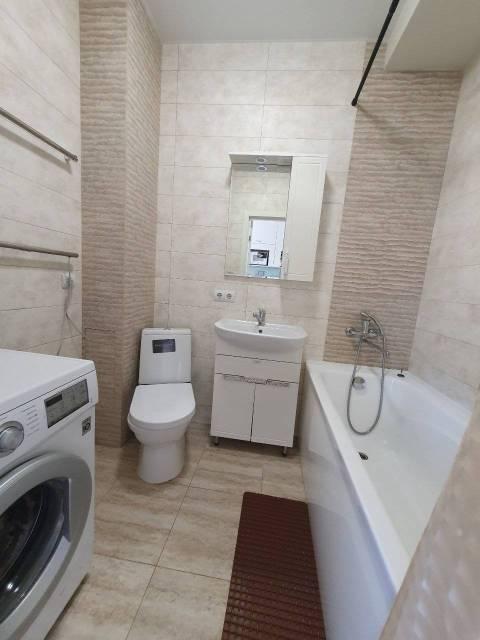 В квартире есть все необходимое для комфортного проживания. Просторная жилая зона объединена с кухней, где установлена современная мебель и техника: посудомоечная машина, холодильник, телевизор, кондиционер и стиральная машина. Санузел совмещенный и оборудован душевой кабиной.
