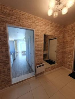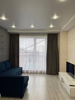 Квартира расположена на первом этаже (уровень 2-го) находится над паркингом, современного кирпичного дома, построенного в 2018 году.