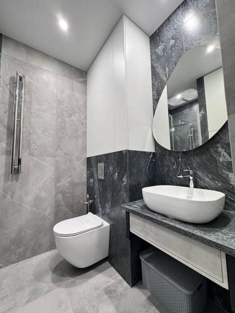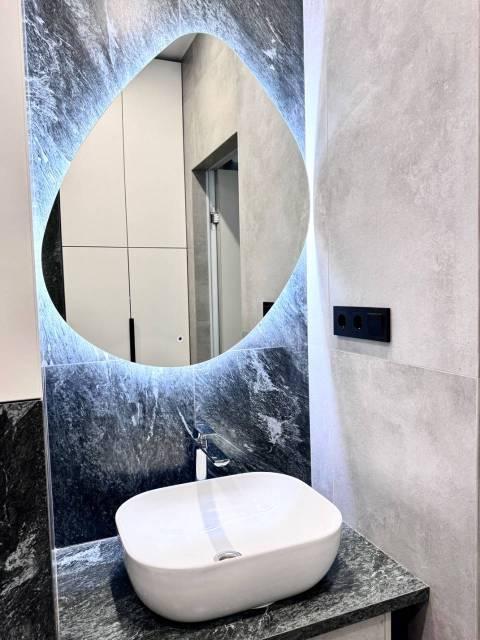 Особенности: Натяжной потолок, Межкомнатные двери, Софиты, Стены выровнены, Тёплый пол, Стеклянная перегородка