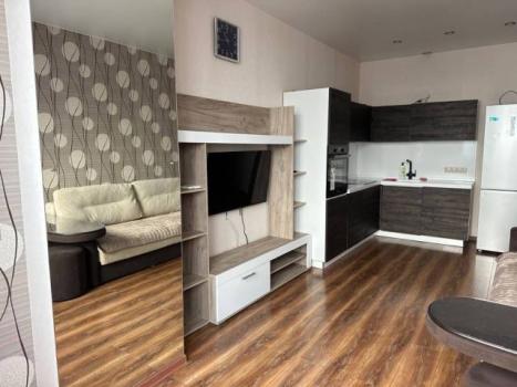 Везде постелен теплый пол, на полу в комнате - паркет- ламинат, на стенах комбинированные обои, натяжной потолок, софиты - люстры, в ванной кафель. Жилая зона разделена на 3 части: спальня, зал - кухня.