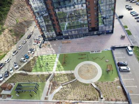 Дворовая территория благоустроена. Зоны отдыха. Уличные тренажеры, спортивный комплекс с грушами, турниками, коробка/каток/баскетбольная площадка. Различные детские площадки: песочница около 50 кв.м., горки разных форм, деревянные домики, лабиринты, арт объект «солнечная система».