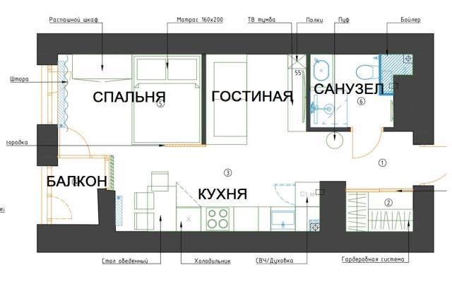 Мебель: Двуспальная кровать, Диван, Кухонный гарнитур, Обеденный стол, Шкаф, Тумба по ТВ, Гардеробная система, Прикроватная тумба