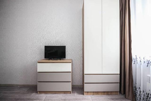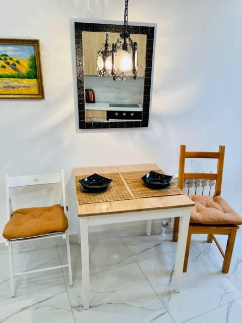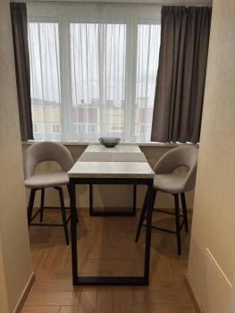 Мебель: В квартире есть всё необходимое для комфортного проживания: Двуспальная кровать, Два журнальных столика, Кресло, Кухонный гарнитур, Обеденный стол, Шкаф-купе.