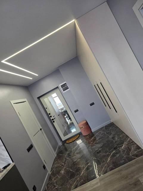 Железная дверь, Натяжной потолок, Пластиковые окна, Софиты, Стены выровнены, Тёплый пол в туалете, Ламинат