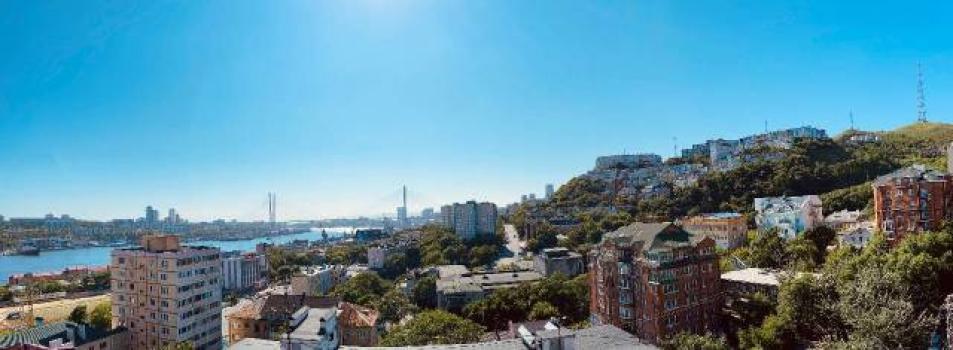 Видны: центр города, бухта Золотой Рог с вантовым мостом, остров Русский, Амурский залив.