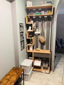 Мебель: Прихожая, Гардеробный шкаф, Кухонный гарнитур, Обеденный стол, Барные стулья, Диван-кровать, Ванный шкафчик, Стеллаж.