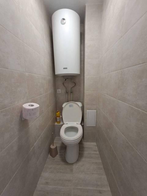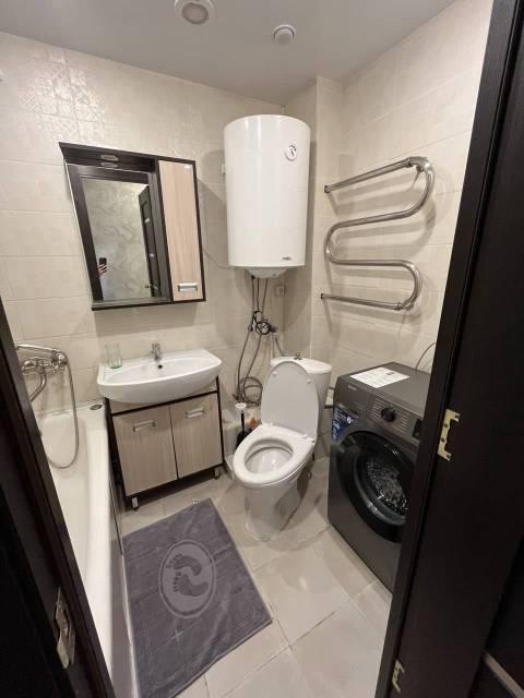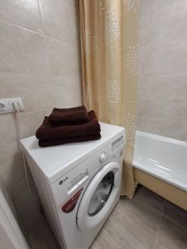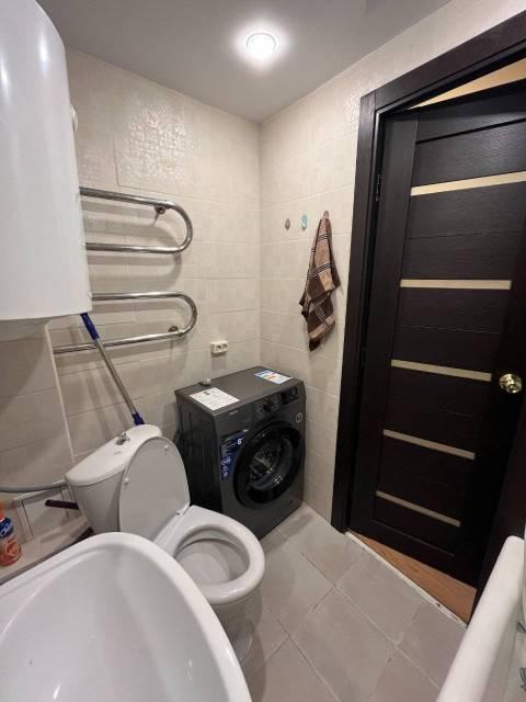 Санузел совмещенный. Есть водонагреватель. Стиральная машина в шкафу в коридоре, на балконе есть сушилка для вещей плюс дополнительная сушилка, которую можно поставить, где угодно.