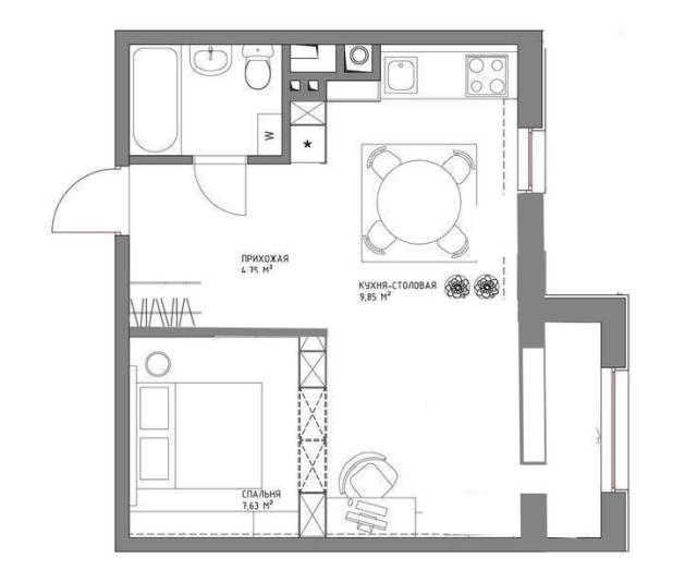 В квартире большой балкон соединён с комнатой , которая составляет 40 квадратов по полу.