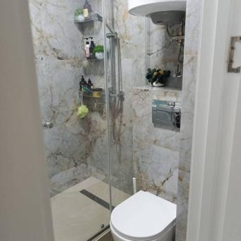 Железная дверь, Натяжной потолок, Пластиковые окна, Софиты, Стены выровнены, Тёплый пол в туалете